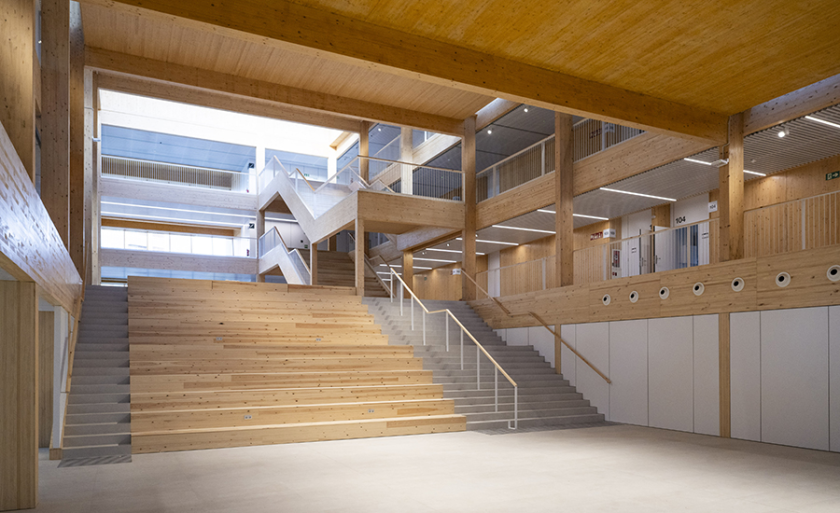 Con más de 13.500 metros cuadrados útiles y una estructura íntegramente de madera laminada y CLT, la nueva facultad es ya la mayor construcción en madera de Navarra y uno de los ejemplos más avanzados de edificación sostenible y energética del ámbito académico ibérico.